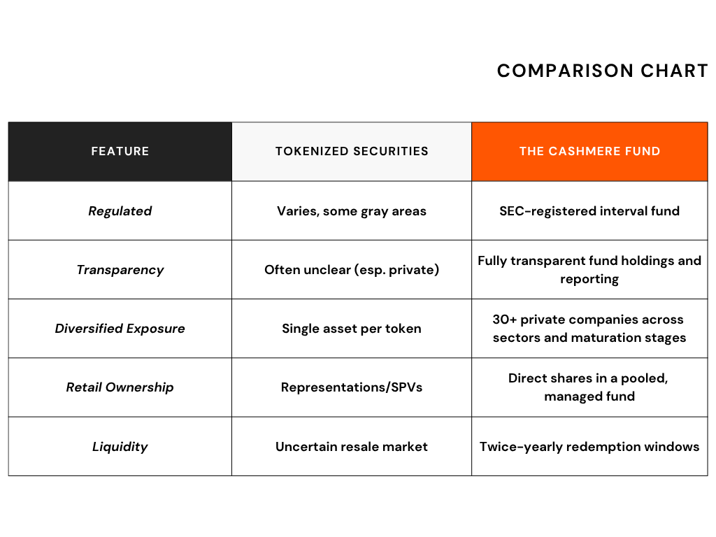 This is a big deal. It further reiterates that access to private market investing is no longer a niche idea. But as this trend gains traction, it's worth asking: what are you actually buying with tokenized securities — and how does it compare to a retail investor-friendly fund like Cashmere?